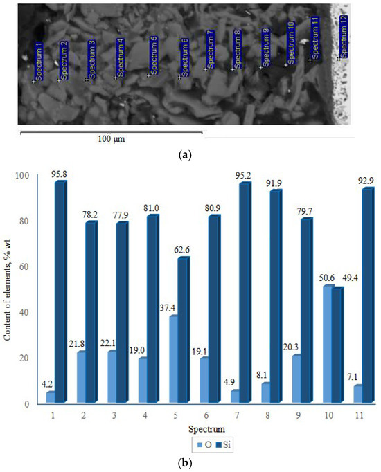 The top layer of the coating consists of discrete crystalline inclusions uniformly distributed across the surface. The morphology of these inclusions is diverse, with predominately plate-like, flake-like, and needle-like shapes arranged in a random spatial distribution. Particle sizes range from 2–5 µm (fine fragments) to 15–20 µm (individual large plates or aggregates). The thickness of this layer is 130–160 µm. It should be noted that the layer thickness depends on the viscosity of the polyhydrosilazane and the withdrawal speed of the samples from the disperse dip-coating system. The coating surface appears dark gray with a slight brownish tint, characteristic of amorphous boron, and exhibits moderate surface roughness, indicating heterogeneity of the microstructure after pyrolysis (Figure 1b).