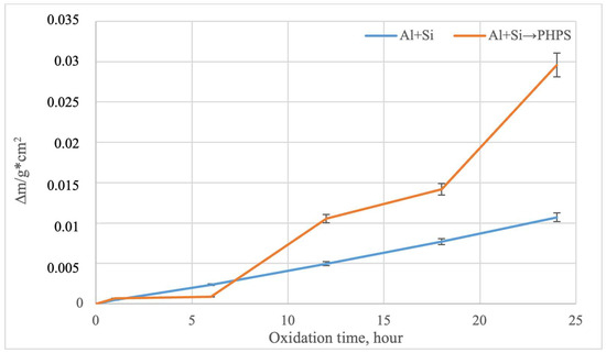 According to previously reported data [13], samples made from the TZM alloy undergo catastrophic corrosion under the given oxidation temperatures, completely evaporating after only 6 h of oxidation. This behavior is associated with the formation of the MoO3 phase, which sublimates at approximately 730 °C and can significantly evaporate [29,30,31]. The study of the oxidation kinetics of molybdenum with different types of coatings revealed a fundamental difference in their protective performance [32,33]. According to the data reported in [22], during the initial stage (up to 4 h of oxidation in air at 800 °C) for samples with PHPS/filler-based coatings, an increase in mass is observed, which is associated with the formation of a glassy SiO2 or SiO2–B2O3 layer on the sample surface. Subsequent changes in mass as a function of time are negligible, indicating surface passivation by the protective film. Figure 10 shows the mass change in the samples during cyclic oxidation at 800 °C on air, a temperature critical for the TZM molybdenum alloy [13].