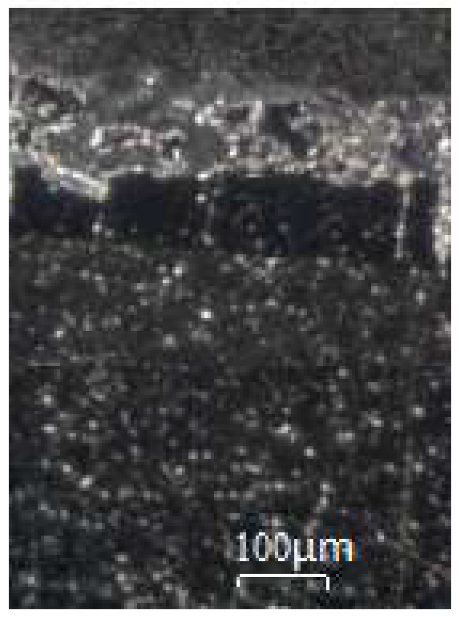 Beneath this layer, there is a light-gray layer with a thickness of 10–15 μm. Within the structure of this layer (Layer II), individual darker gray inclusions were observed, with sizes ranging from 1–3 μm (and in some cases up to 5–6 μm) (