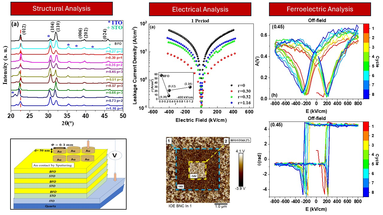 Multilayer heterostructures of [(BiFeO3)m/(SrTiO3)n]p were synthesized on ITO-coated quartz substrates via pulsed laser deposition, with varying thickness ratios (r = n/m) and periodicities (p = 1–3). Structural, electrical, and piezoelectric properties were systematically investigated using X-ray diffraction, AFM, and PFM. The BiFeO3 layers crystallized in a distorted rhombohedral phase (R3c), free of secondary phases. Compared to single-layer BiFeO3 films, the multilayers exhibited markedly lower leakage current densities and enhanced piezoelectric response. Electrical conduction transitioned from space-charge-limited current at low fields (E < 100 kV/cm) to Fowler–Nordheim tunneling at high fields (E > 100 kV/cm). Optimal performance was achieved for r = 0.30, p = 1, with minimal leakage (J = 8.64 A/cm2 at E = 400 kV/cm) and a peak piezoelectric coefficient (d33 = 55.55 pm/V). The lowest coercive field (Ec = 238 kV/cm) occurred in the configuration r = 0.45, p = 3. Saturated hysteresis loops confirmed stable ferroelectric domains. These findings demonstrate that manipulating layer geometry in [(BiFeO3)m/(SrTiO3)n]p stacks significantly enhances functional properties, offering a viable path toward efficient, lead-free piezoelectric nanodevices.