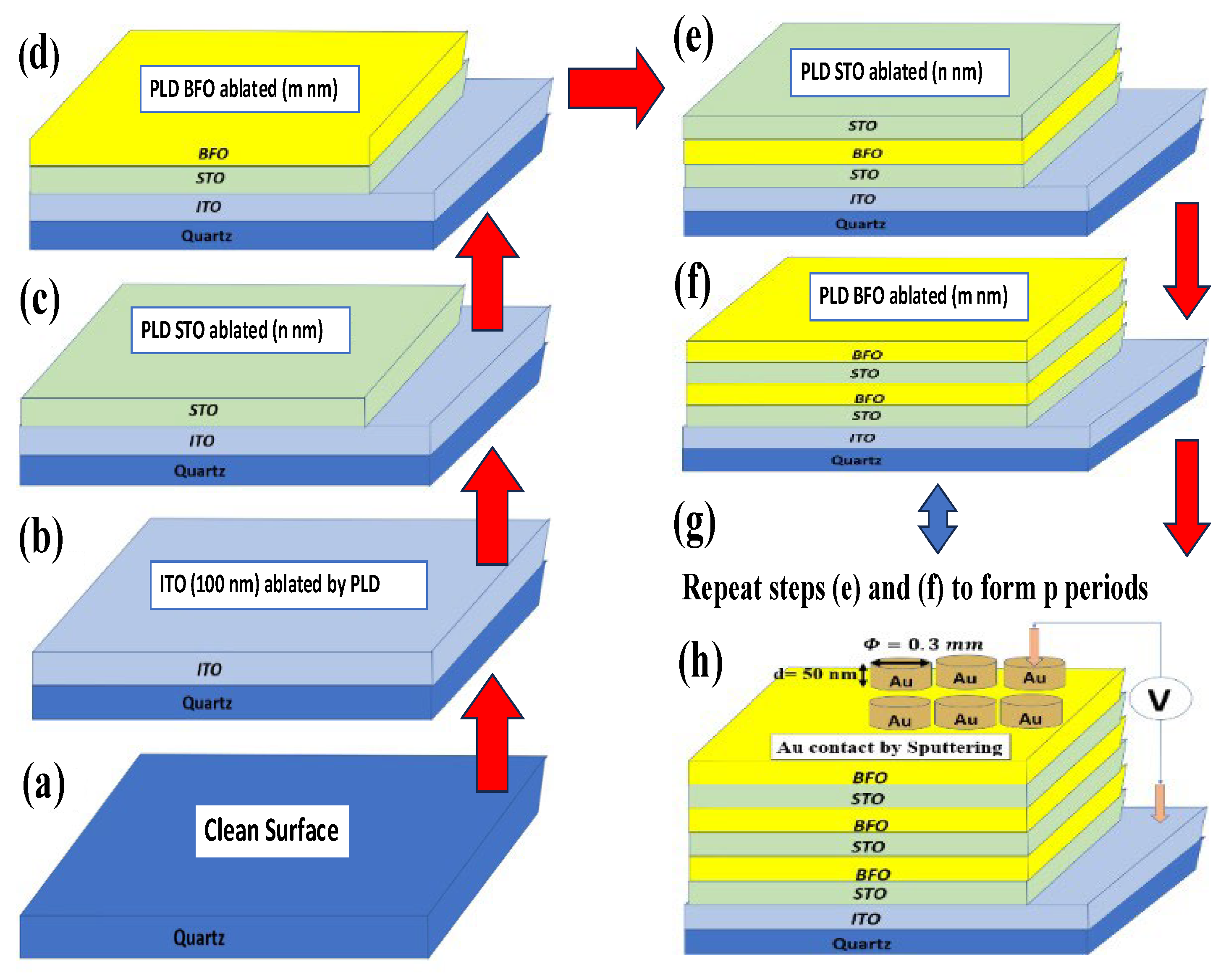 Figure 1. Schematic diagram of the Au/BFO/STO/ITO/quartz deposition process: (a) cleaned substrate surface, (b) deposition of the ITO bottom electrode, (c) deposition of the STO layer with variable thickness (n), (d) deposition of the BFO layer with variable thickness (m) over the STO layer, (e) subsequent STO layers with variable thickness (n) over the BFO layer, followed by (f) another BFO layer with variable thickness (m), repeating for additional periods (g), and (h) final deposition of top Au electrodes for electrical testing.