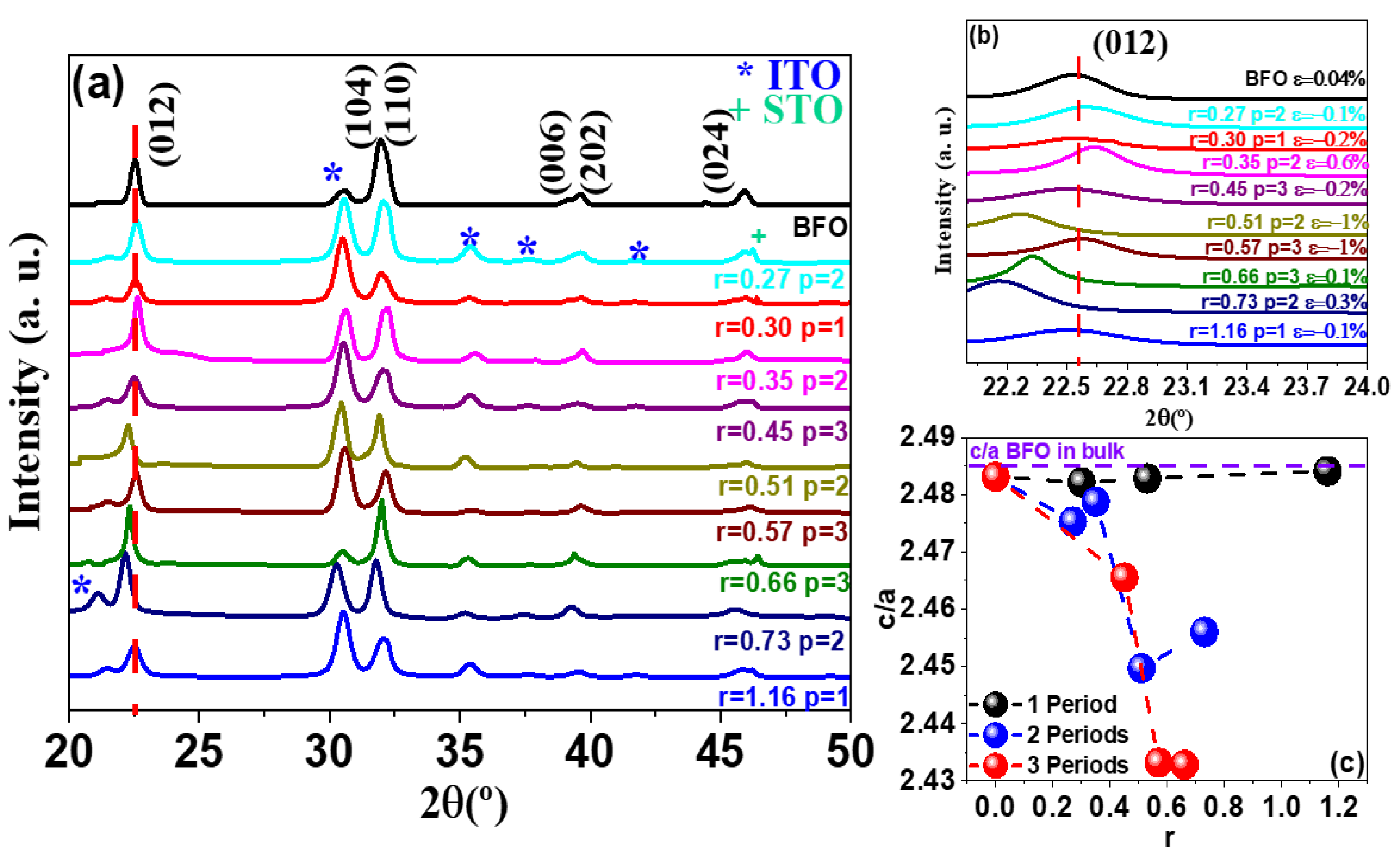 Table 1. The variations in structural parameters, including the lattice constants “a” and “c”, the c/a distortion ratio, unit cell volume, crystallite size, Bi-O bond length, and O-Fe-O bond angle for BFO/STO thin films as a function of the thickness ratio r and period.