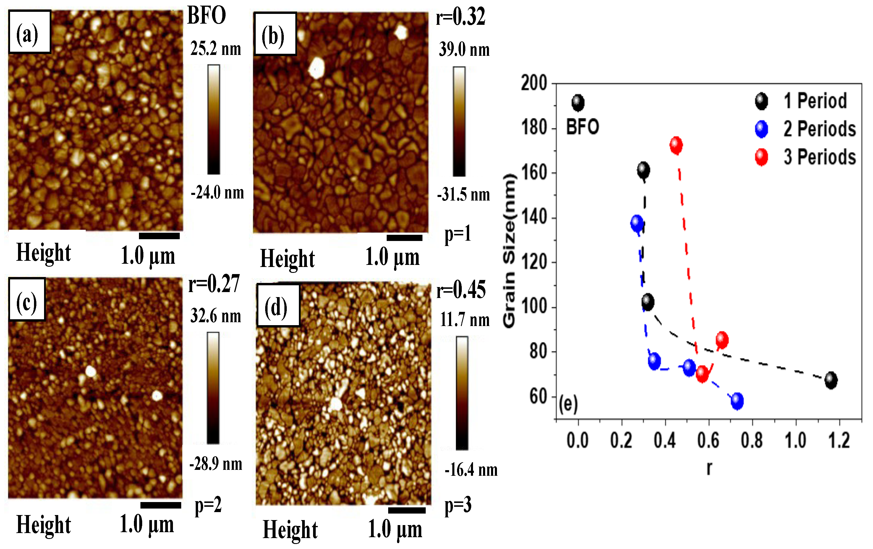Figure 3. Surface morphology and grain size evolution in [(BiFeO3)m/(SrTiO3)n]p multilayer films as a function of layer thickness ratio r and stacking period p. (ad): 5 µm × 5 µm atomic force microscopy topography maps for four representative thickness ratios: r = 0 (a), 0.32 (b), 0.27 (c) and 0.45 (d). Each height map is shown with its own z-scale. (e) Quantitative grain size analysis extracted from AFM images for films with 1 period (black circles), 2 periods (blue circles), and 3 periods (red circles). The average grain diameter is plotted versus r.