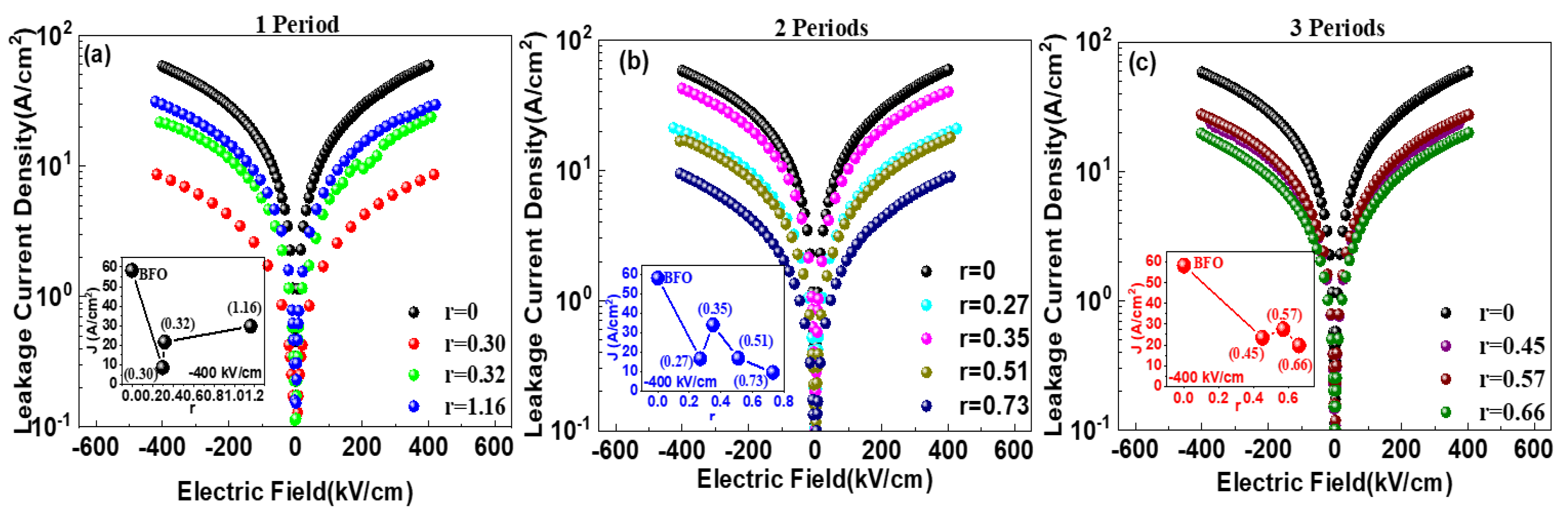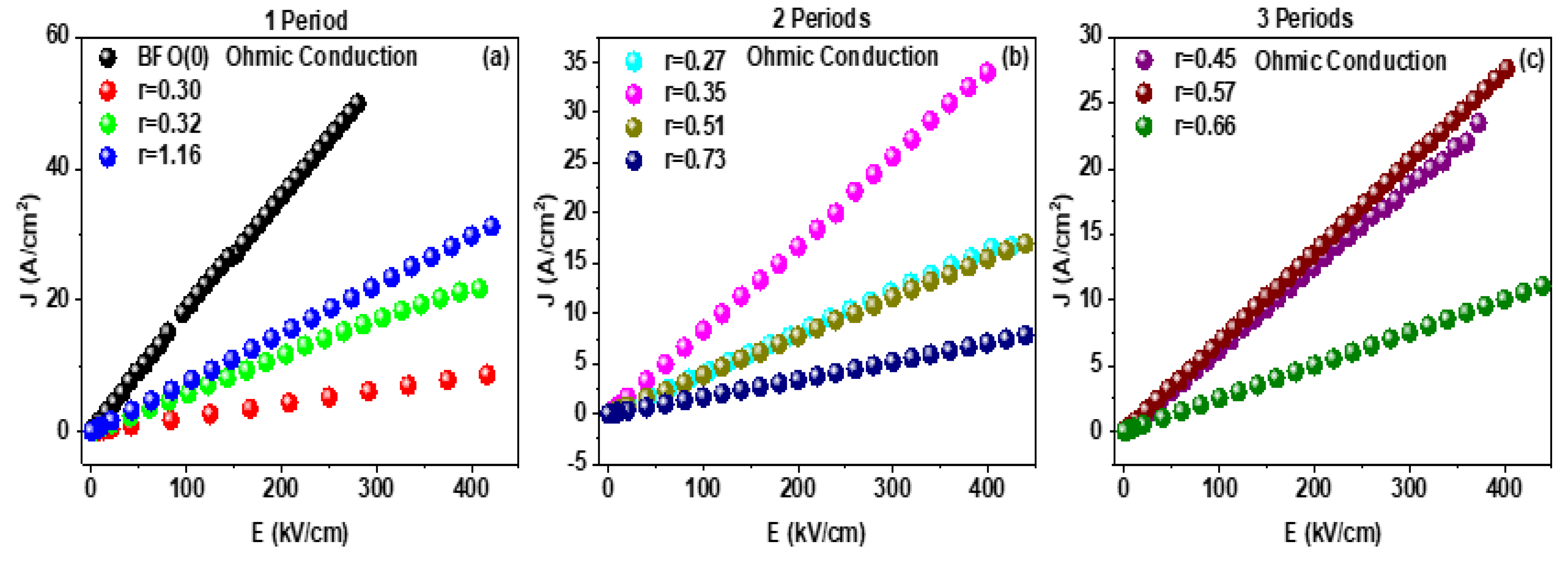 Figure 6. J–E characteristics of BFO/STO multilayer films with (a) one, (b) two, and (c) three periods. All samples exhibit ohmic conduction, with current density decreasing as the STO layer thickness ratio (r) and the number of periods increase, demonstrating effective leakage suppression by the STO barriers.