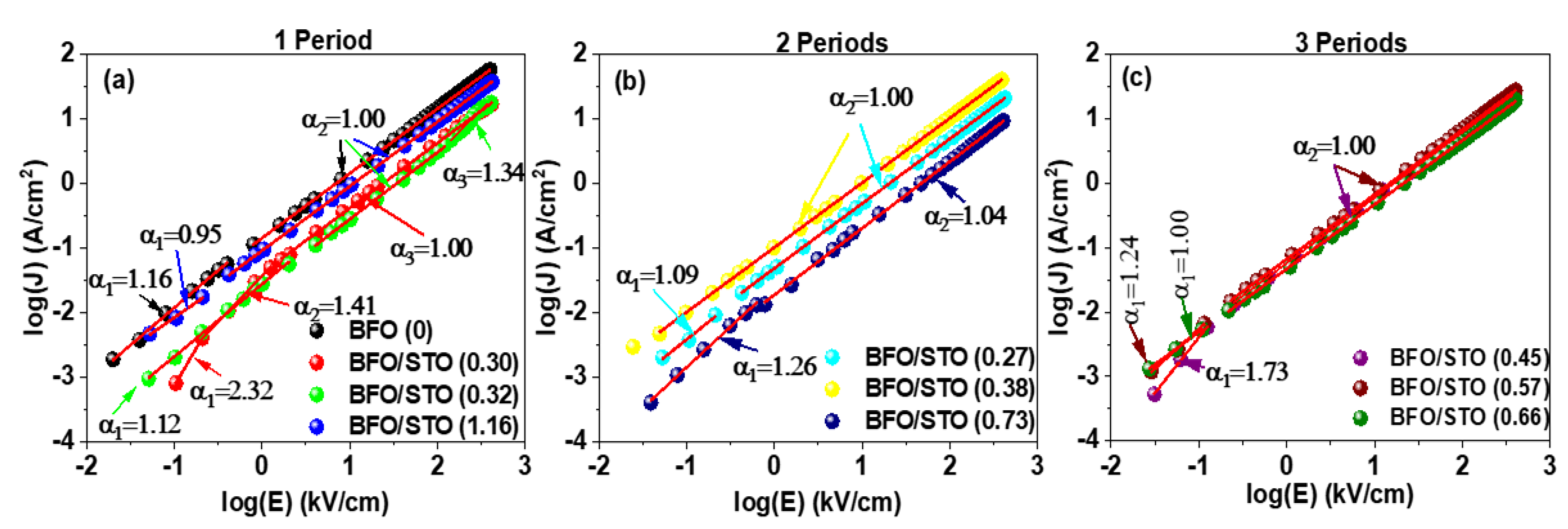 Figure 5. Double-logarithmic plots of current density log (J) versus electric field log (E) for BiFeO3/SrTiO3 (BFO/STO) multilayer thin films with different periodicities: (a) one period, (b) two periods, and (c) three periods. The slopes (α) extracted from the linear regions indicate different conduction mechanisms. For α ≈ 1, ohmic conduction dominates, whereas higher values (α > 2) are associated with trap-filled space-charge-limited conduction (SCLC).