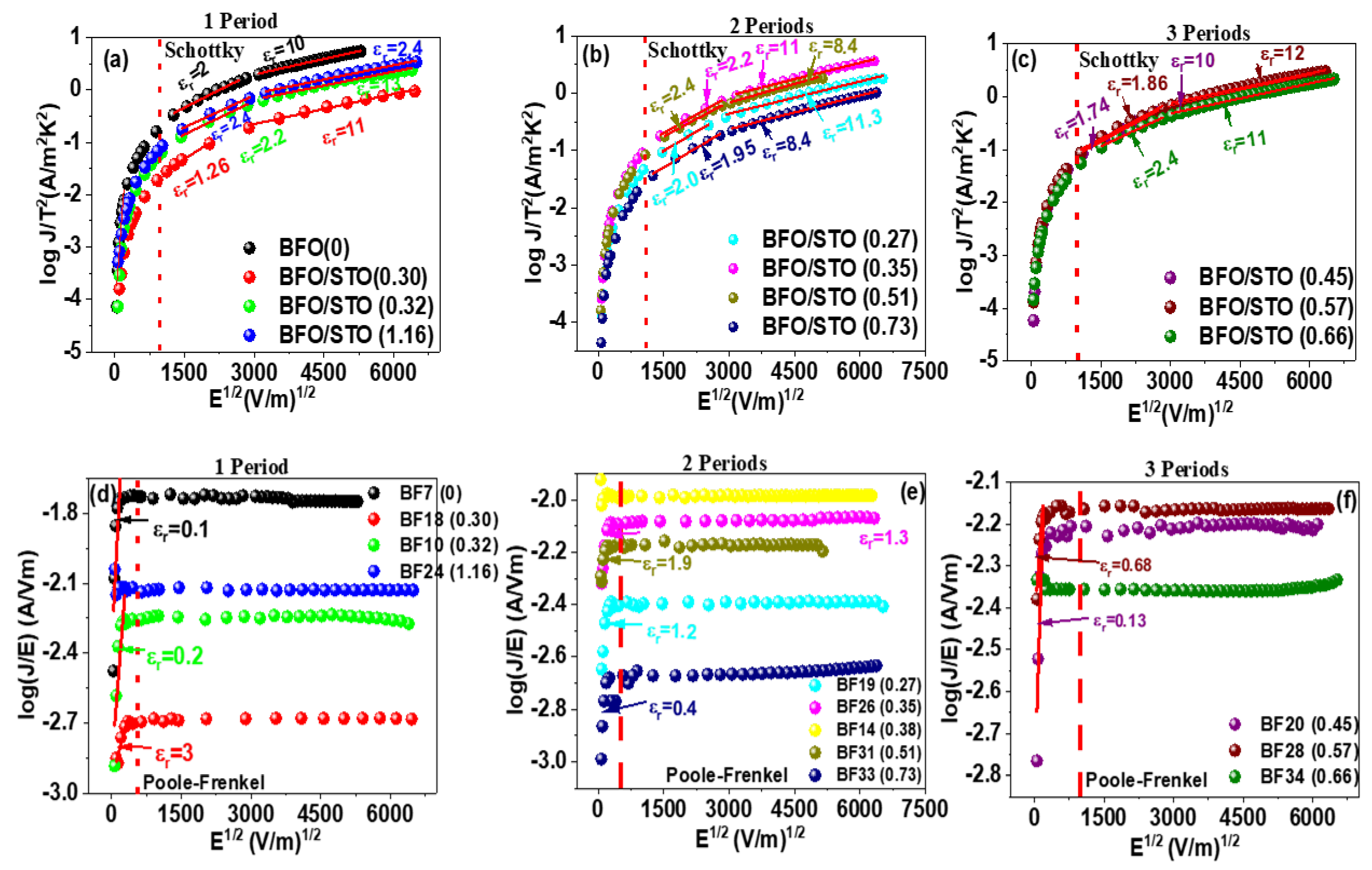 Figure 7. Plots of log (J/AT2) vs. E1/2 of the STO/BFO heterostructures per STO to BFO thickness ratio and period. (ac) show the Schottky plots of log(J/T2) versus E1/2 for samples with 1, 2, and 3 periods, respectively. The linear relationship observed in the high-field region of these plots is characteristic of thermionic emission over a Schottky barrier. The red dashed lines represent linear fits to the data, from which the optical dielectric constant ( ε r ) is extracted for each sample configuration. (df) present the Poole-Frenkel plots of log(J/E) versus E1/2 for the same sets of samples. A linear trend in these coordinates is indicative of Poole-Frenkel emission, a bulk-limited conduction mechanism involving field-assisted thermal excitation of trapped charge carriers.
