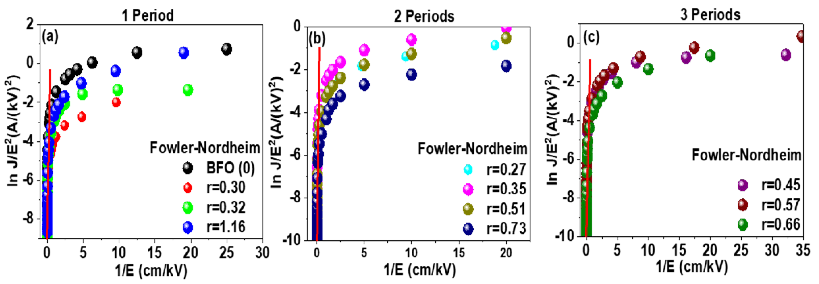 Figure 8. Plots of ln (J/E2) vs. 1/E of the STO/BFO heterostructures with different STO to BFO thickness ratios (r) and periods. (a) Pure BFO (0) and 1 Period r = 0.30 (red), r = 0.32 (green) and r = 1.16 (blue). Introducing STO layers reduces leakage, shifting curves downward; (b) 2 Periods r = 0.27 (cyan), r = 0.35 (magenta), r = 0.51 (dark yellow) and r = 0.73 (navy); (c) 3 Periods r = 0.45 (purple), r = 0.57 (wine) and r = 0.66 (olive).