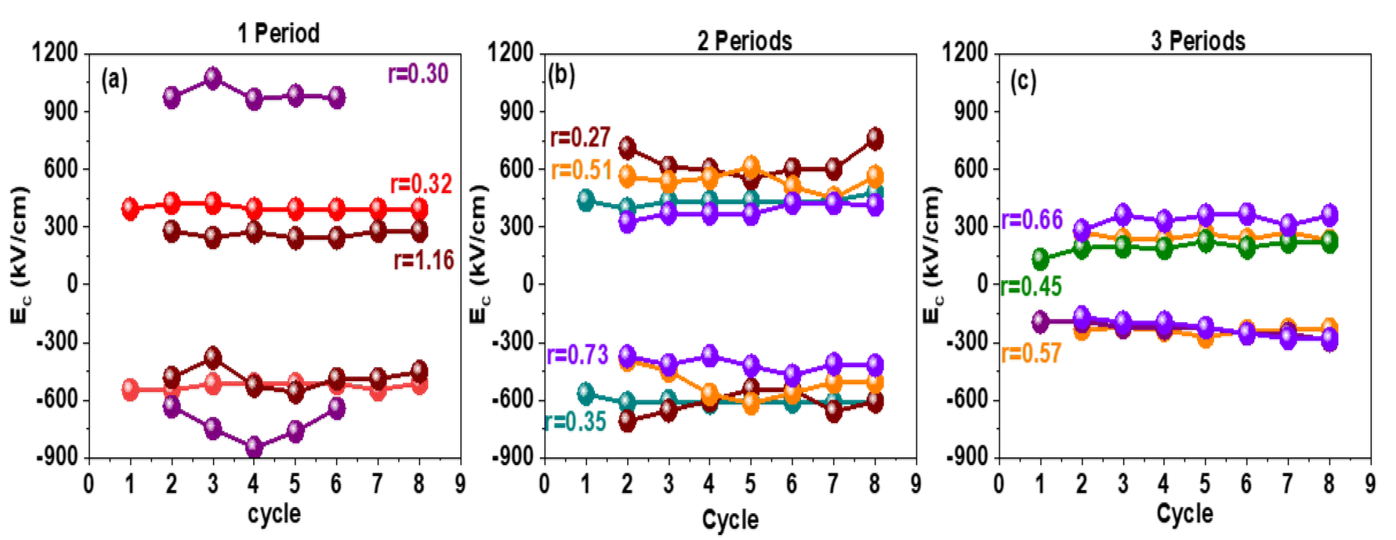 Figure 10a–c show the variation in room temperature Ec values as a function of the switching cycle for one, two, and three periods. The data reveals that both the number of periods and the thickness ratio affect the coercive field, with increasing number of periods reducing the coercive field until a minimum value of Ec = 238 kV/cm for p = 3 and r = 0.45. Given that ferroelectric ordering in BiFeO3 originates from rhombohedral distortion caused by the Bi3+ lone pair (6 s2) and the strong Bi-O hybridization [42], any weakening in the Bi-O bonds suggests a lower energy requirement to disrupt the ferroelectric state or alter the polarization. Hence, the reduction in Ec can be a direct consequence of the weakening of the Asite-O bonds.