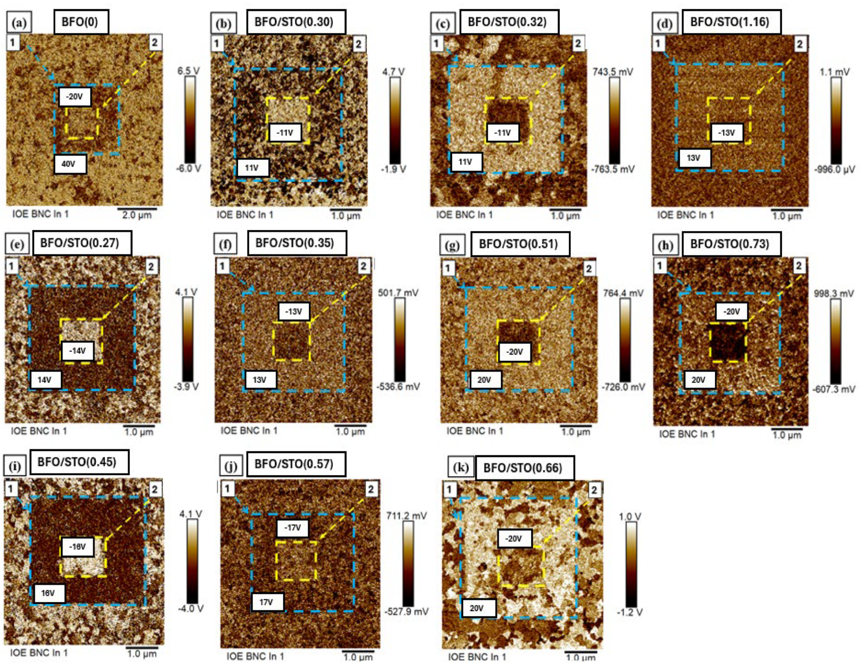 Figure 11. PFM phase maps from regions in the BFO/STO film where a max volt of +20 V and a min of −20 V were applied. (a) Pure BFO film without STO insertion. Inner yellow dashed square written with −20 V and outer blue dashed square written with +40 V; (b) BFO/STO with ratio 0.30. Inner yellow dashed square written with −11 V and outer blue dashed square written with +11 V. Switching requires a lower voltage compared to pure BFO, suggesting easier polarization switching due to STO influence; (c) BFO/STO with ratio 0.32. Inner yellow dashed square written with −11 V and outer blue dashed square written with +11 V. Switching requires the same voltage compared to 0.30 system, but a better contrast is shown suggesting easier polarization switching; (d) BFO/STO with ratio 1.16. Inner yellow dashed square written with −13 V and outer blue dashed square written with +13 V. Switching requires a higher voltage compared to 0.32, suggesting less easier polarization switching; (e) BFO/STO with ratio 0.27. Inner yellow dashed square written with −14 V and outer blue dashed square written with +14 V. Switching requires a higher voltage compared to 0.32, suggesting less easier polarization switching; (f) BFO/STO with ratio 0.35. Inner yellow dashed square written with −13 V and outer blue dashed square written with +13 V; (g) BFO/STO with ratio 0.51. Inner yellow dashed square written with −20 V and outer blue dashed square written with +20 V; (h) BFO/STO with ratio 0.73. Inner yellow dashed square written with −20 V and outer blue dashed square written with +20 V; (i) BFO/STO with ratio 0.45. Inner yellow dashed square written with -18 V and outer blue dashed square written with +18 V; (j) BFO/STO with ratio 0.57. Inner yellow dashed square written with −17 V and outer blue dashed square written with +17 V; (k) BFO/STO with ratio 0.66. Inner yellow dashed square written with −20 V and outer blue dashed square written with +20 V.