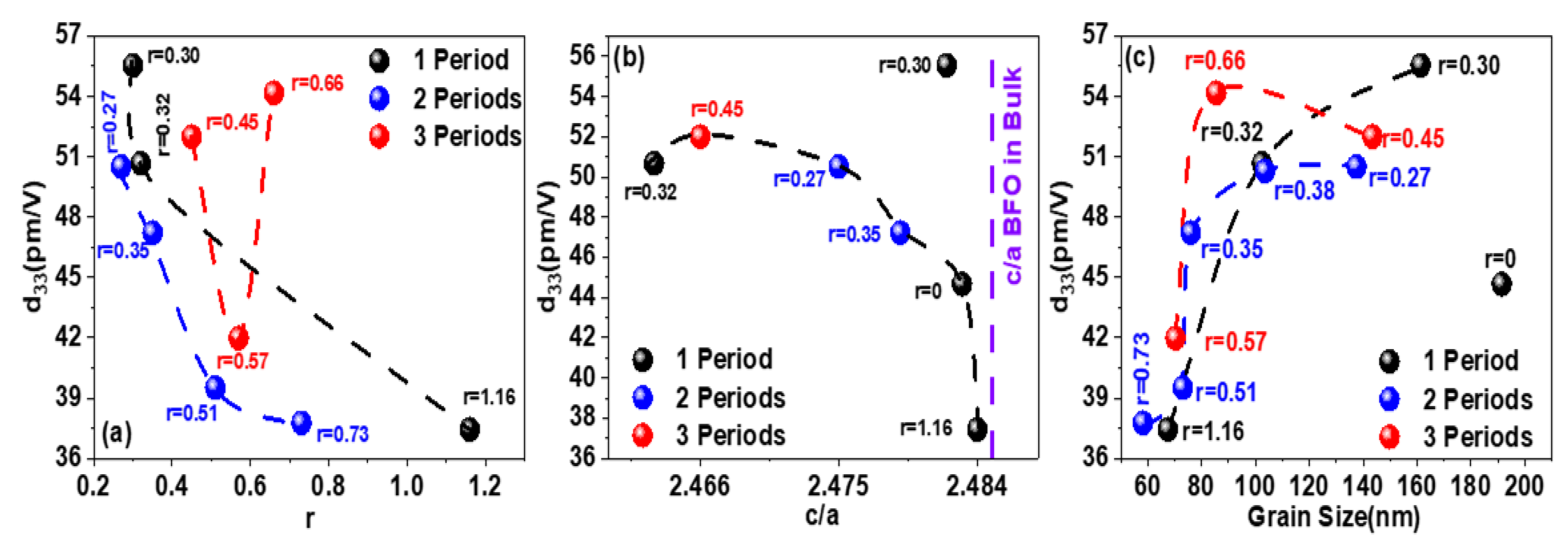 Figure 12. (a) Piezoelectric coefficient d33 as a function of the thickness ratio r for one, two, and three periods. (b) Piezoelectric coefficient d33 as a function of the c/a ratio for one, two, and three periods. (c) Piezoelectric coefficient d33 as a function of the grain size for one, two, and three periods.
