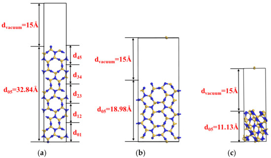 Due to the long-range effect, when the number of atomic layers was equal to or greater than five layers, the interaction energy between the internal atoms and the surface was considered to be approximately zero so the maximum thickness of this study was only calculated to five adjacent atomic layers near the surface. The unit cell model of the different crystal planes of the four-layer β-Si3N4 crystal is shown in Figure 3.