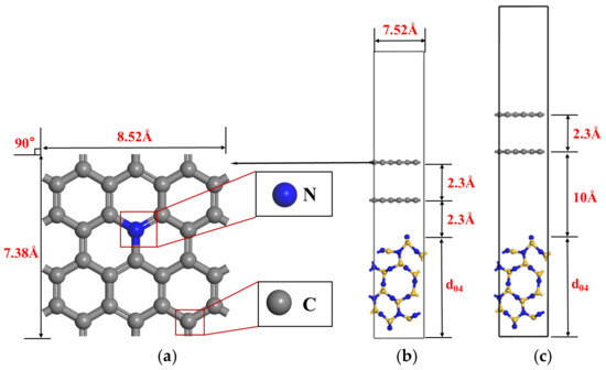 In this study, the optimized lattice constant of graphene was a = b = 2.46 Å, and the optimized lattice constant of the β-Si3N4 crystal (111) crystal plane was a =b = 8.22 Å. The modeling method of the N-GQDs@β-Si3N4 heterostructure is as follows. The 3 × 3 supercells on the (111) surface of the β-Si3N4 crystal are used as the bottom layer, and the GQDs form 10 × 10 supercells. Following the method of a related study [39], three C atoms are substituted with N atoms on each 5 × 5 supercell model to construct the N-GQD model (as shown in Figure 4a). Finally, the double-layer N-GQDs are matched with the (111) surface of the β-Si3N4 crystal to form the N-GQDs@β-Si3N4 heterostructure (as shown in Figure 4b). The interlayer spacing between N-GQDs was 2.3 Å.