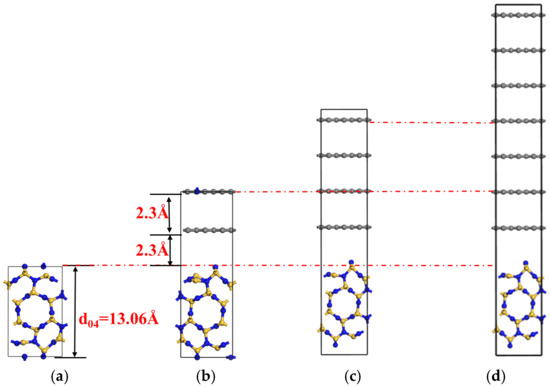 The experimental results show that the lignin doping amount was proportional to the number of layers of N-GQDs. When the nano-lignin doping amount was 2 wt.%, the best comprehensive performance was obtained. At this time, the number of layers of N-GQDs was 6–8 layers. Figure 7 shows the crystal structure model of Si3N4-based composites with different numbers of layers of graphene. It is predicted that in order to improve the mechanical properties of the composites, the doping amount should be between 1 wt.% and 2 wt.%.