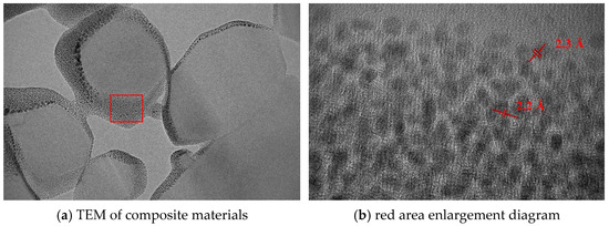 In previous studies [14,15,16,17] using transmission electron microscopy, the composite material was shown to be composed of N-GQDs coated on the surface of β-Si3N4 columnar crystals. The size of the N-GQDs was 8.99 nm2, the number of layers was 6~8, and the interlayer spacing was 2.2~2.3 Å (as shown in Figure 8b).
