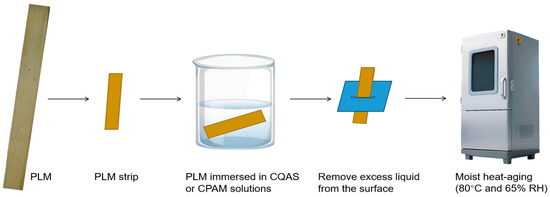 The PLMs were cut into strips measuring 15 cm × 2 cm, immersed in CQAS or CPAM solutions for 5 s, and passed through a slit to remove excess liquid from the surface. The treated samples were air-dried at 25 °C for 48 h. The PLM samples encapsulated with CPAM and CQAS are designated as PLM-CPAM and PLM-CQAS, respectively. The schematic diagram depicting the procedure for test specimen preparation and moist heat-aging treatment is presented in Figure 1.