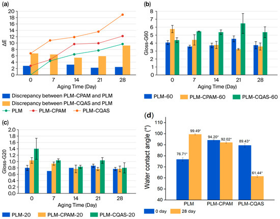 Changes in the (a) color difference, (b) gloss G60, (c) gloss G20, and (d) static contact angle of PLMs, PLM-CPAM, and PLM-CQAS.