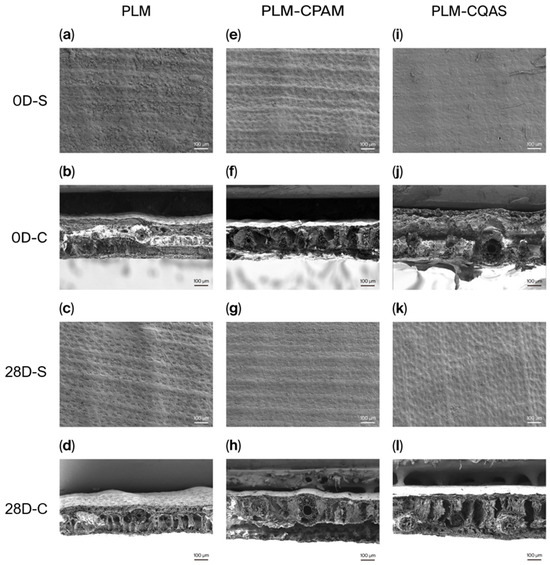 SEM images of the surfaces and cross-sections of (a–d) PLMs, (e–h) PLM-CPAM, and (i–l) CQAS after moist heat aging treatment. (D—day; S—surface; C—cross-section).