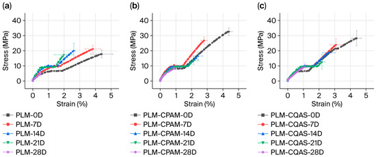 Tensile properties of (a) PLMs, (b) PLM-CPAM, and (c) PLM-CQAS after moist heat aging treatment. (D—day).