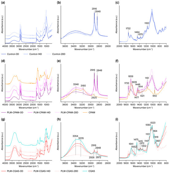 Infrared spectra of (a–c) PLMs, (d–f) PLM-CPAM, and (g–i) PLM-CQAS after moist heat aging treatment (D—day).