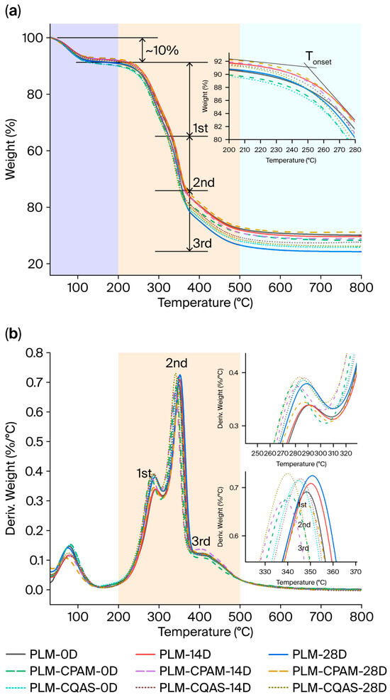 (a) TGA and (b) DTG results for PLMs, PLM-CPAM, and PLM-CQAS after moist heat-aging treatment (D—day).
