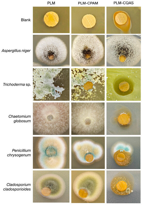 The PLM-CPAM samples exhibited significant inhibitory effects against Trichoderma sp. and Penicillium chrysogenum, evidenced by a marked decrease in mycelial thickness. However, the inhibitory boundary against Aspergillus niger was challenging to distinguish due to its dense and dark mycelium, which compromised its effectiveness. It is also noteworthy that Chaetomium globosum continued to thrive on the PLM-CPAM surface, suggesting that CPAM is largely ineffective against this particular strain.
