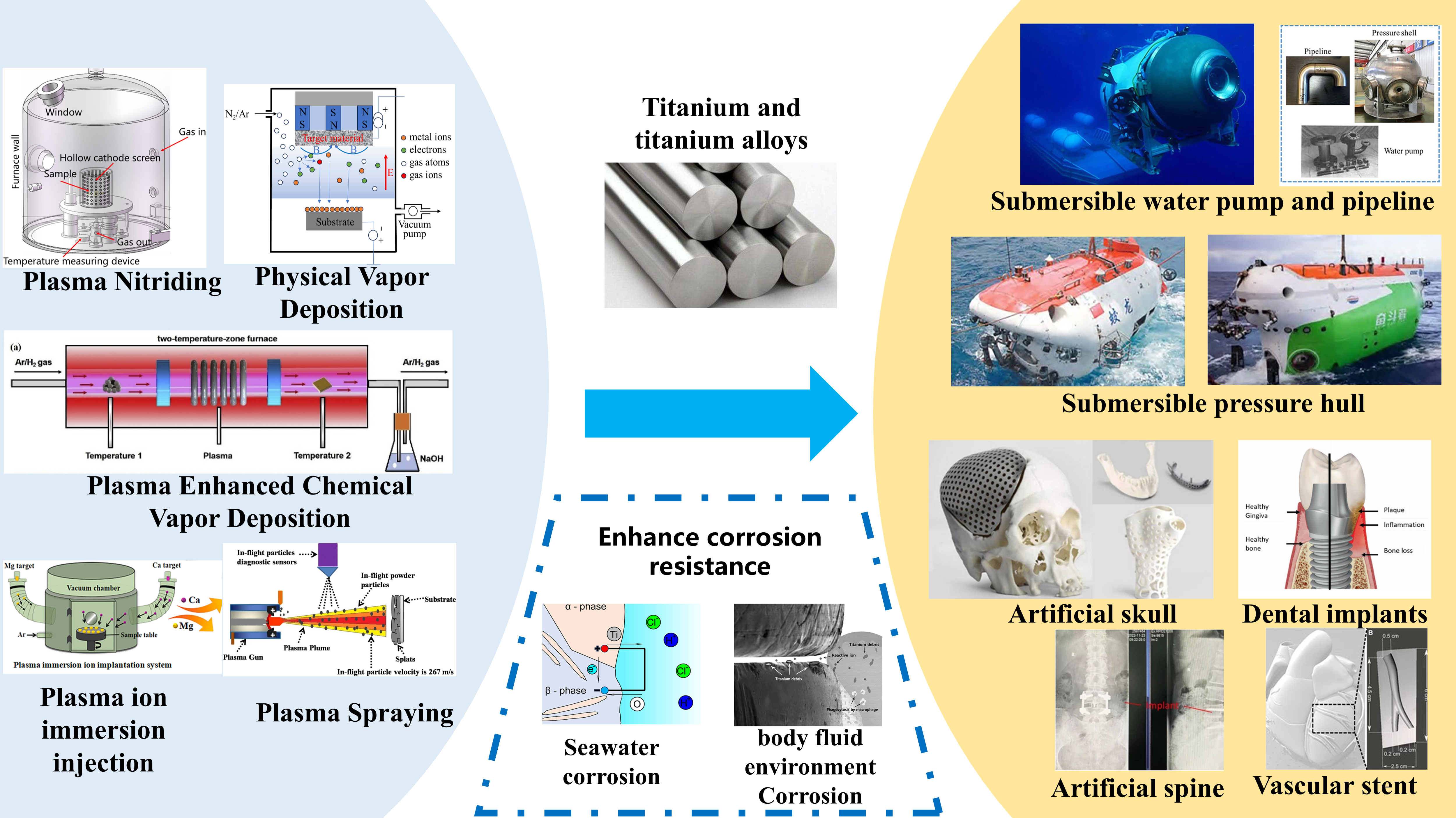 PN | Submersible hull, turbine blades, bone implant | High diffusion efficiency, energy-saving and environmental protection abilities, and good bonding strength of the reinforcement layer | The temperature of the workpiece is difficult to accurately control, and complex shape processes have serious edge effects and arcing phenomena |