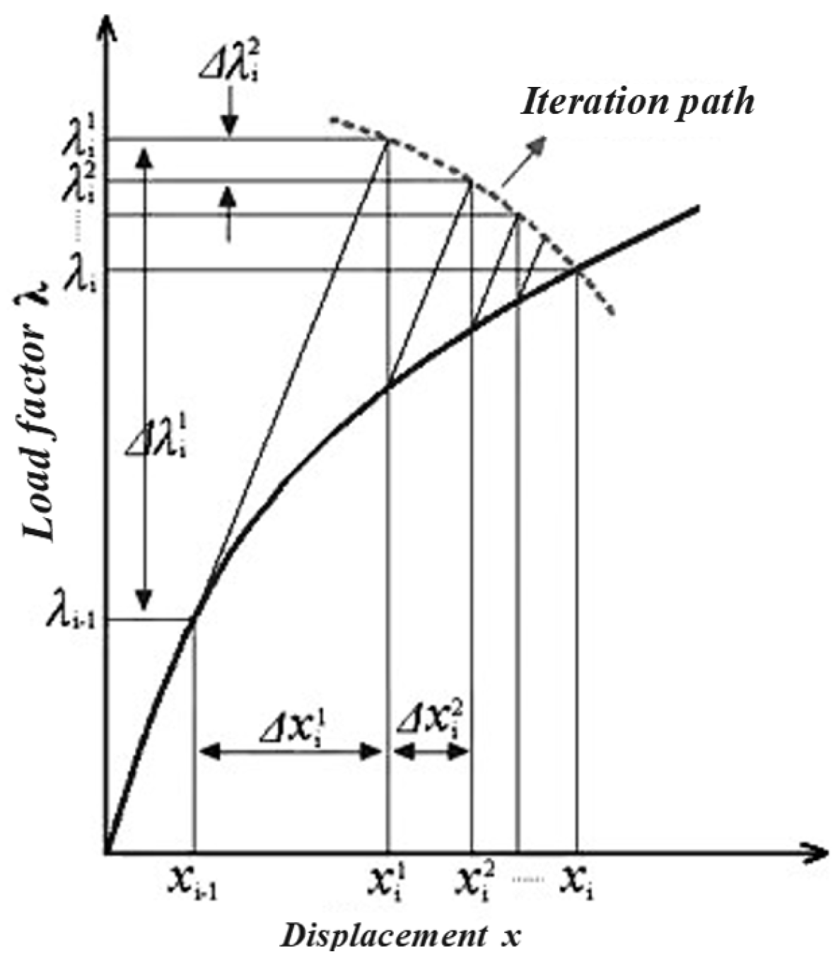 Figure 3. Iterative solution process of the Riks algorithm [34].