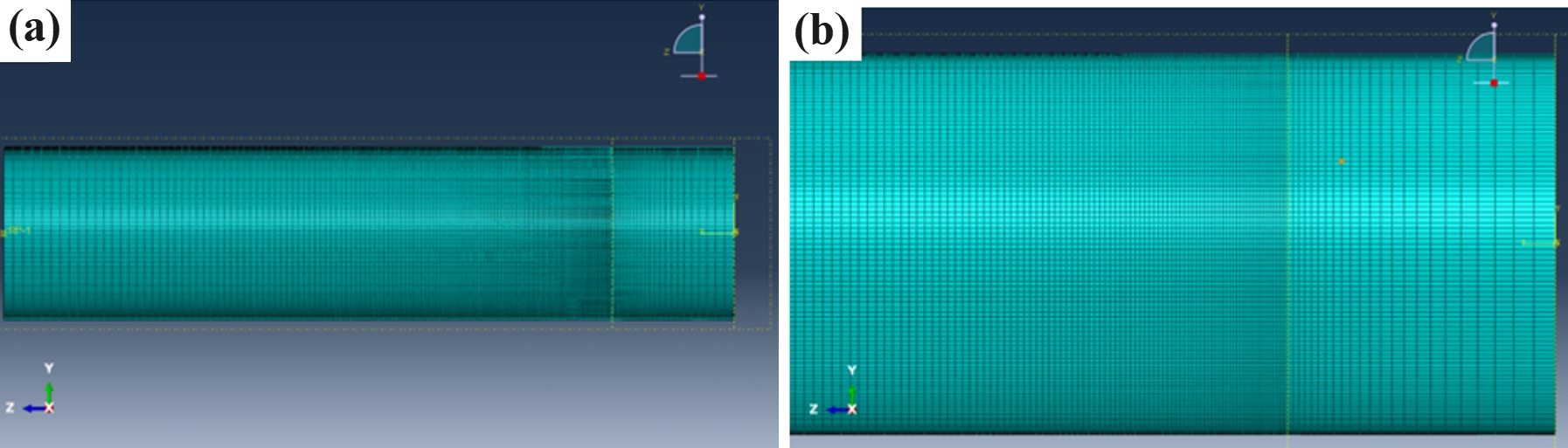 Figure 6. (a) Global mesh of X80 pipeline. (b) Bending section mesh.
