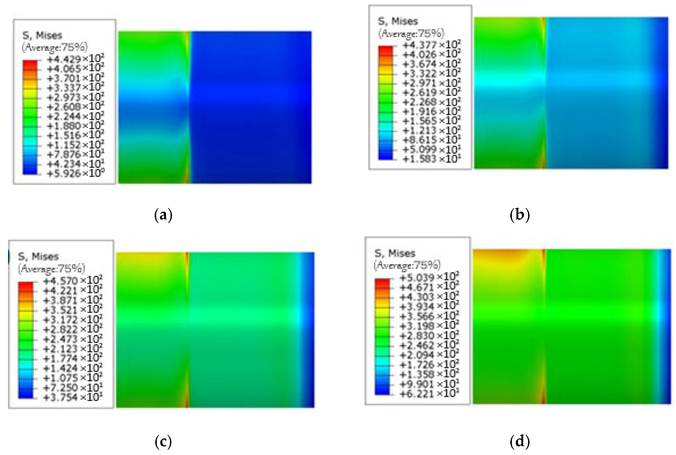 Figure 20. Stress–strain distributions of sleeves with different heights obtained from numerical simulations. From top to bottom: (a) h = 10, (b) h = 20, (c) h = 30, (d) h = 40.