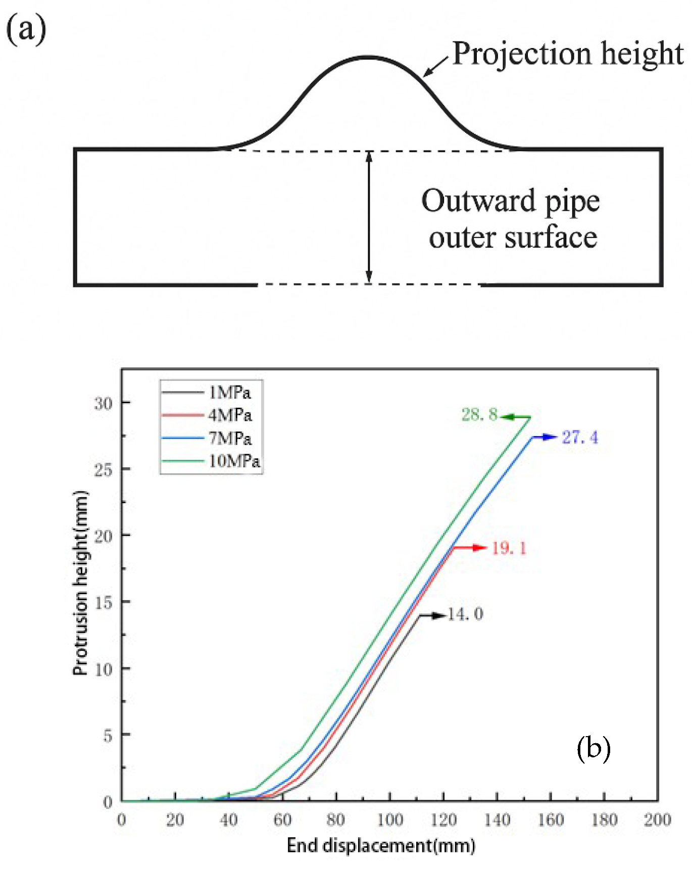 Figure 13b illustrates the relationship between protrusion height and tail-end displacement for an API-X80 pipeline with an outer diameter of 1016 mm and a wall thickness of 12.8 mm under the failure criterion. It can be observed that the protrusion height increases with the increase in tail-end displacement. For the X80 pipeline with a wall thickness of 12.8 mm, the protrusion height remains nearly zero when the tail-end displacement is less than 35 mm. Once the displacement reaches approximately 70 mm, the protrusion height exhibits an almost linear increase with further displacement. Moreover, the maximum protrusion height increases with rising internal pressure. When the internal pressure reaches 10 MPa, the maximum protrusion height is observed to be 28.8 mm.