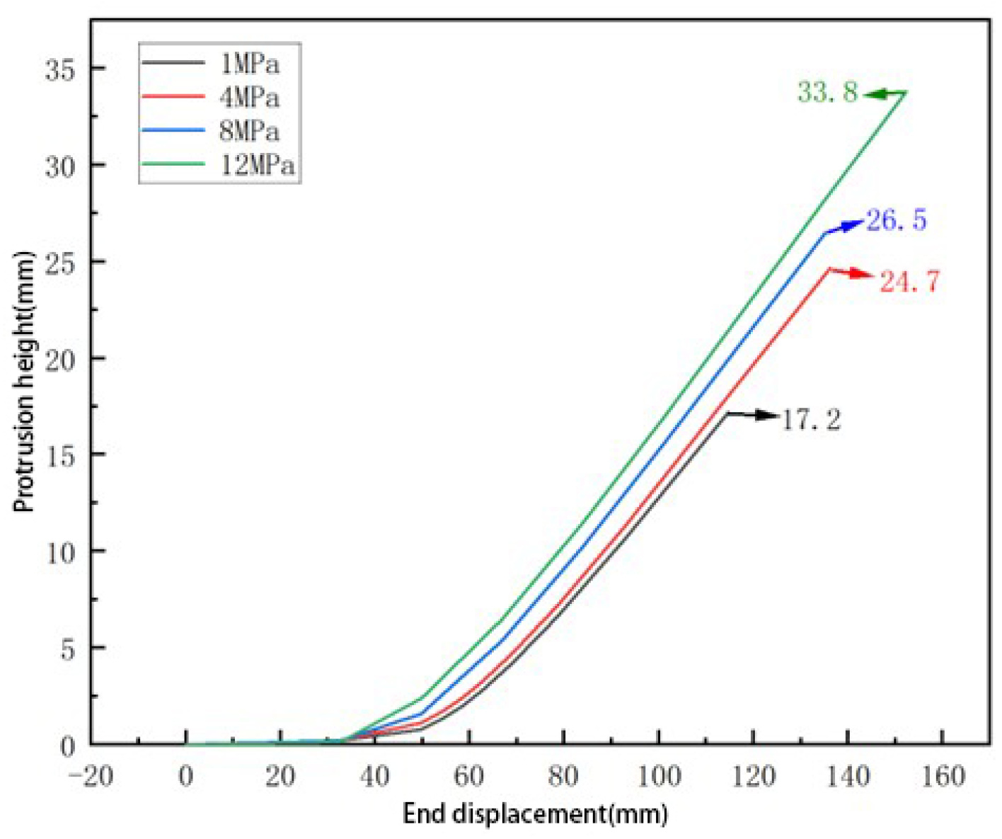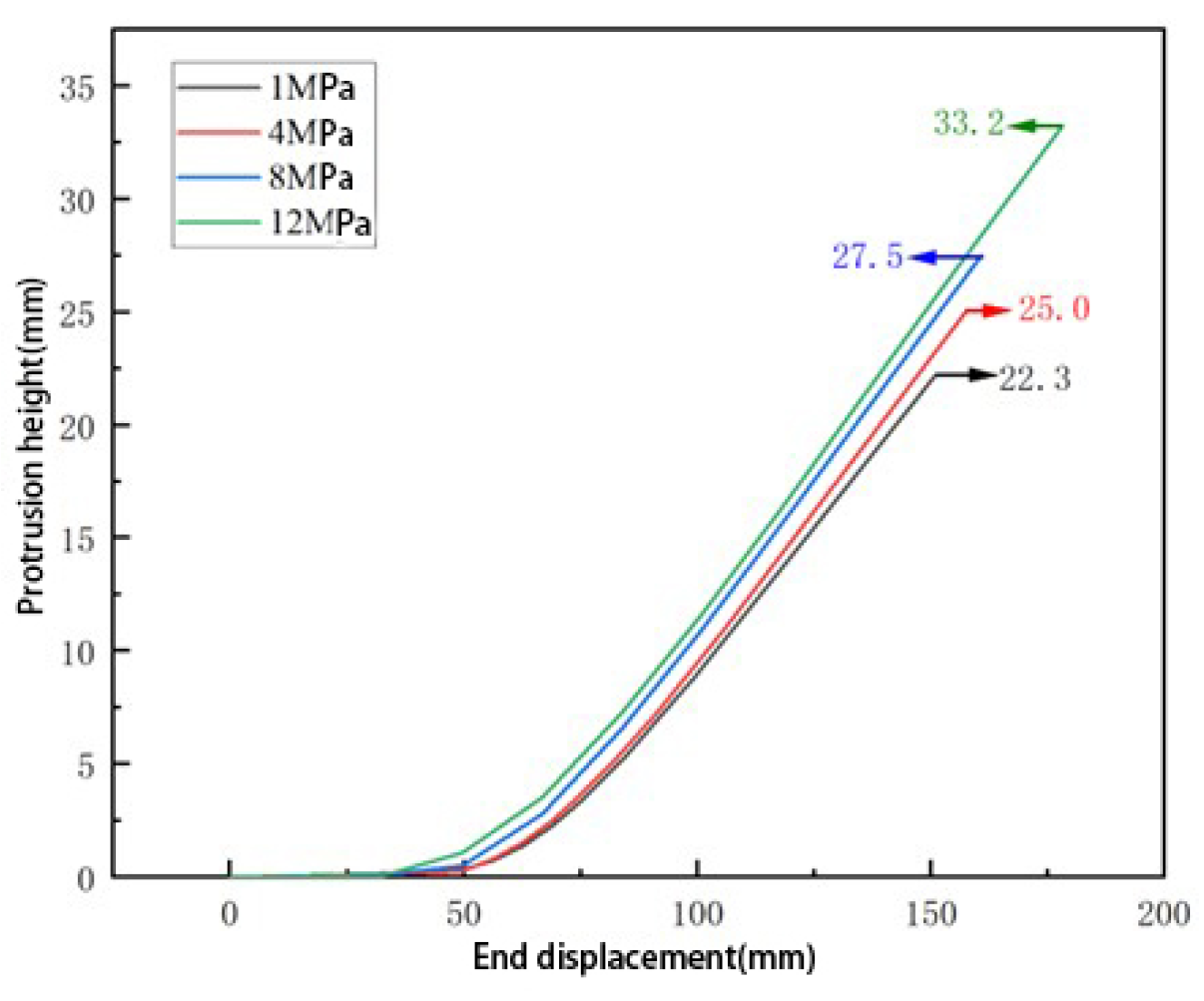 Figure 15. Protrusion height vs. end displacement of X80-1422-25.4 pipeline under varying internal pressures.