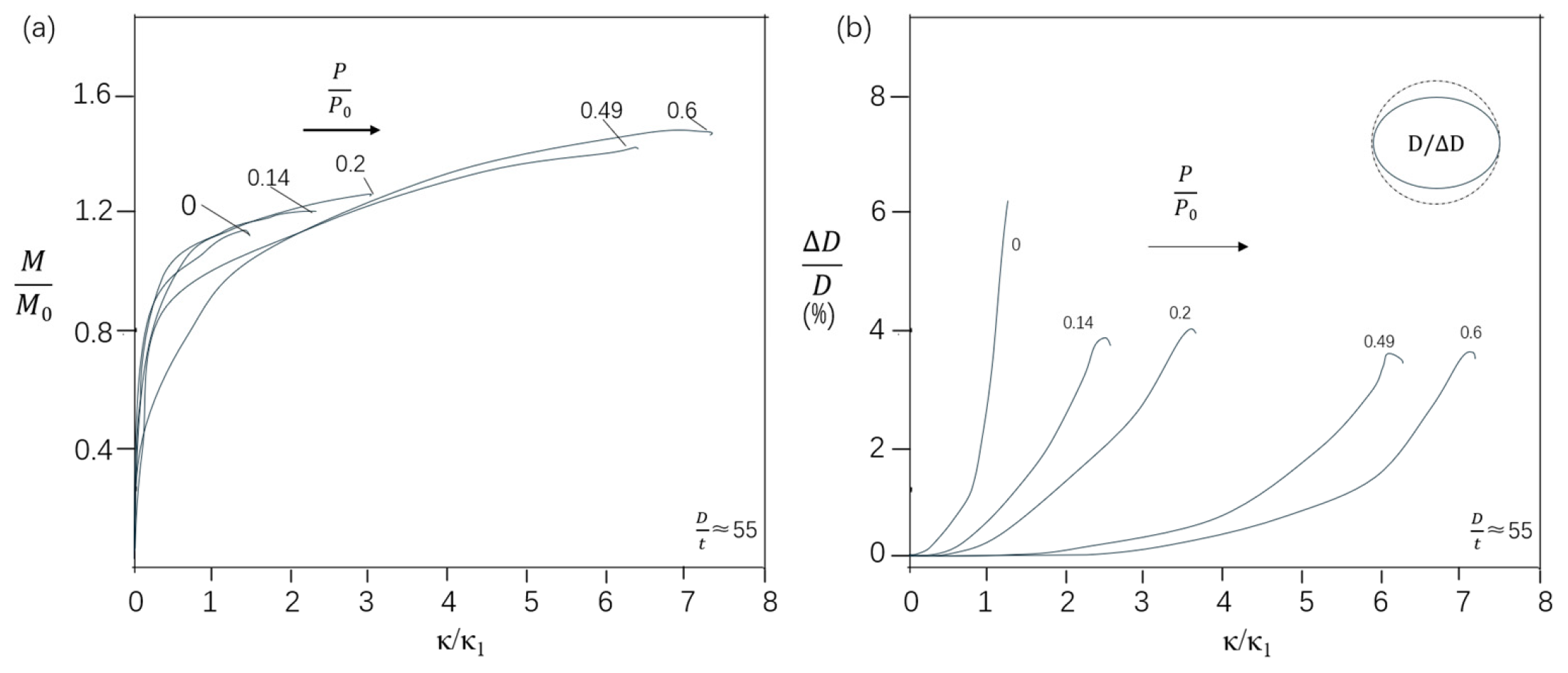 Figure 16. (a) Moment-curvature response of pipeline bending collapse under varying internal pressures, and (b) Corresponding diameter variation in the bending plane [37].