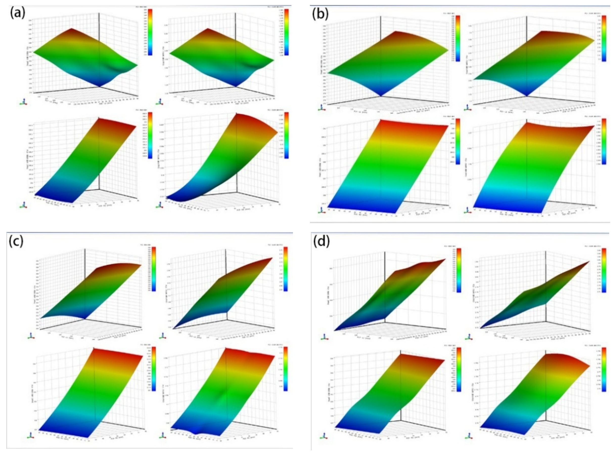 Figure 23. Response surface contour plots of sleeves with varying heights: (a) h = 10, (b) h = 20, (c) h = 30, (d) h = 40.