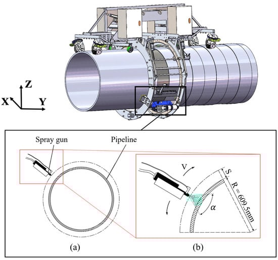 At present, manual repair spraying is inefficient, with coating thickness fluctuations reaching ±50 μm, making it difficult to meet modern industrial demands for high precision and high efficiency. With the rapid development of industrial automation technology, automated spraying systems are gradually becoming mainstream. Automated spraying technology can achieve high repeatability through program control, reducing human interference and significantly improving the stability of coating quality. Graco [11] launched the XM70 multi-component high-pressure airless spraying system, which uses PLC control to realize closed-loop monitoring of spraying ratio, temperature, pressure, and coating thickness. In typical applications, it can complete internal and external pipe segment coating within 30 min while maintaining approximately 500 μm thickness consistency. Bonatti [12] developed the “MCL Machine” for weld seam coating repair scenarios, achieving uniformity and high repeatability of coating thickness through precise control of spraying speed and mixing ratio. In addition, CRC Evans [13] provides automated equipment packages such as SABRE, IMPP, MCL, and FFJ, capable of performing automatic weld seam sandblasting, preheating, and precise overlay of powder/liquid coatings, widely applied in both onshore and subsea pipeline coating operations. VR Coatings [14] offers an automated external wall spraying system that employs high-pressure airless spray guns and automated travel mechanisms, improving efficiency, stability, and coating uniformity in repair applications. The background of this study is based on the field of pipeline joint coating, which exhibits a considerable degree of process specificity. The joint-coating procedure exerts a certain influence on both the properties of the coating material and the spraying method.