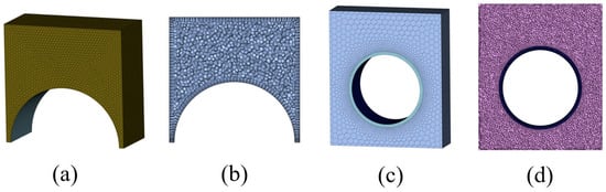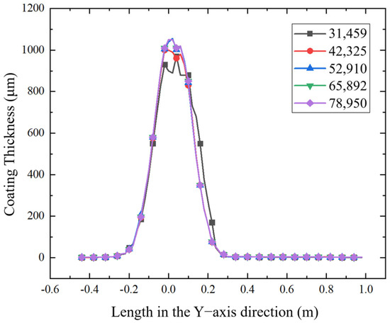 Upon completion of preprocessing, the model is imported into FLUENT Meshing for mesh generation. The entire spray scenario constitutes the computational domain, which is entirely filled with air. The injection source is located within this domain, and the paint droplets are discharged and adhere to the pipe surface, forming the coating layer. A polyhedral cell is employed to populate the domain, chosen for its superior convergence behavior at lower cell counts compared to tetrahedral and hexahedral cells. Surface mesh resolutions range from 20 mm (minimum) to 100 mm (maximum). The polyhedral cell uses a maximum cell size of 37 mm with a growth rate of 1.2. Additionally, three boundary-layer prism layers are applied near the wall to enhance the accuracy of particle adhesion predictions on the pipe surface. Figure 6 presents the paint film thickness along the Y-axis across different mesh densities (31,459; 42,325; 52,910; 65,892; 78,950 cells). The results show that as mesh density increases, the thickness distribution curves converge, with negligible variation beyond 52,910 cells—indicating mesh independence. Thus, the simulations have passed the mesh-independence test, and meshes containing more than 52,910 cells are deemed sufficient to ensure accuracy while maintaining computational efficiency. The final meshes are illustrated in Figure 7 (static spray scenario: 268,033 nodes and 52,910 cells; moving spray scenario: 575,753 nodes and 113,654 cells).