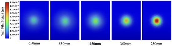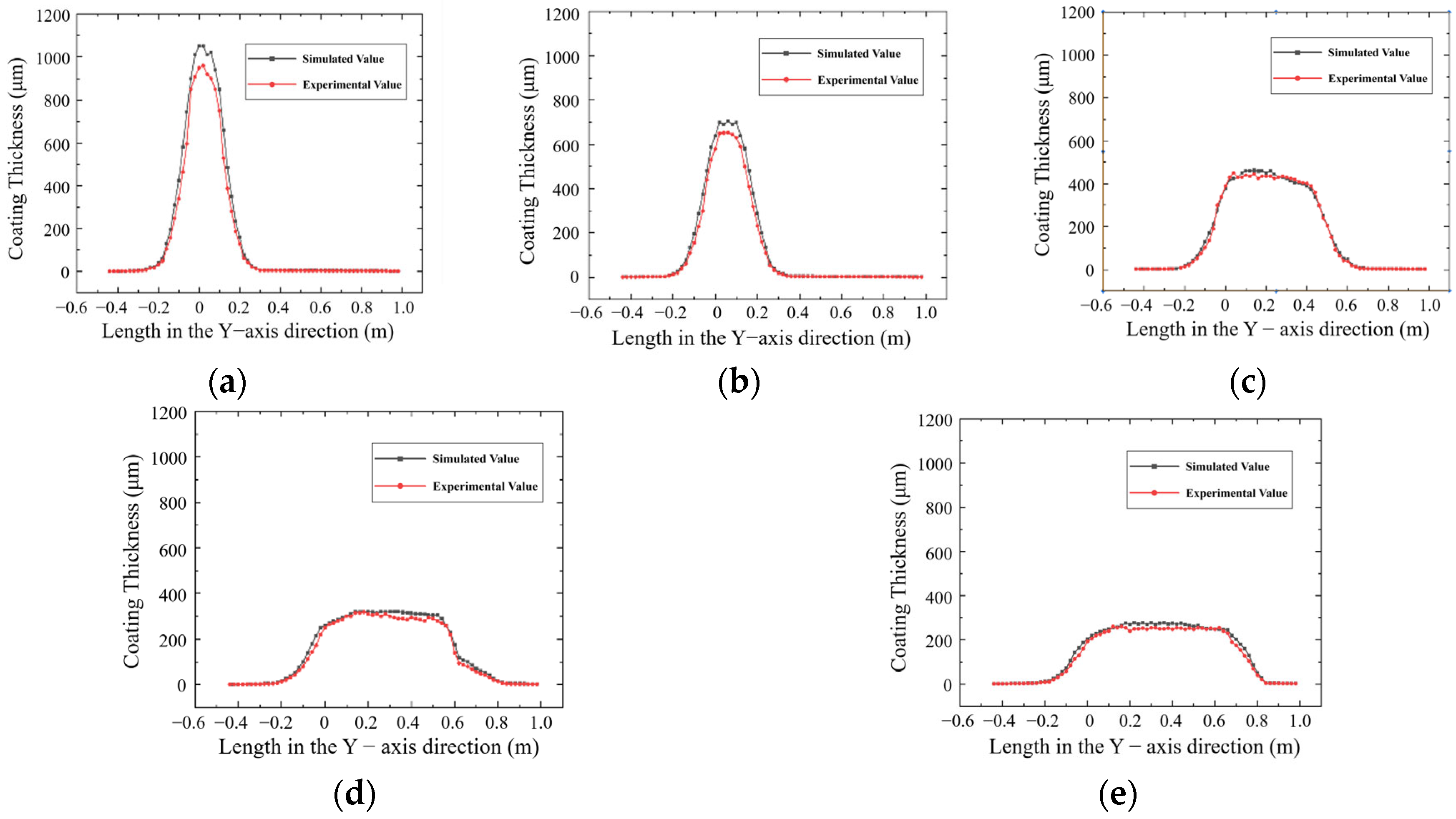 Figure 8 illustrates the paint deposition characteristics under different preset nozzle heights, ranging from 650 mm to 450 mm with a step size of 10 mm. Five sets of simulation experiments were conducted.
