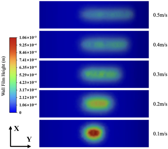 Figure 11 shows the deposition characteristics of the paint at different surface velocities of pipelines, with velocities set at 0.1 m/s, 0.2 m/s, 0.3 m/s, 0.4 m/s, and 0.5 m/s.