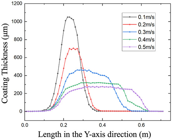 As illustrated in Figure 11, coating thickness exhibits a negative correlation with spray gun traversal speed. With increasing gun velocity, the resulting film thickness diminishes. To gain deeper insights into thickness distribution characteristics, data were extracted along the centerline in the gun’s motion direction, as shown in Figure 12. These results indicate that spray speed significantly impacts coating quality: At a low speed of 0.1 m/s, although the coated area is minimal, the film quality is optimal—the maximum thickness reaches a stable 1058 µm, with uniform distribution. Increasing the speed to 0.5 m/s expands the coverage area but degrades coating quality: The maximum thickness drops to 318 ± 8 µm and pronounced thickness gradients appear, attributable to uneven paint deposition at higher speeds.
