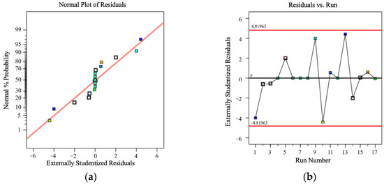 This study applied multiple statistical methods to systematically validate the constructed multiple regression model. As shown in Figure 13a, the residual normal probability plot reveals that the observed data points lie approximately along the reference line, confirming that the residuals conform to the normality assumption for error terms. Furthermore, the results of the analysis of variance (ANOVA) indicate that all regression terms are statistically significant (i.e., ), validating the relevance of each predictor. Figure 13b presents the residuals-versus-order (run) plot, which exhibits a random scatter without discernible patterns—indicating no evidence of heteroscedasticity or autocorrelation, such as variance drift or systematic dependence over the observation sequence.