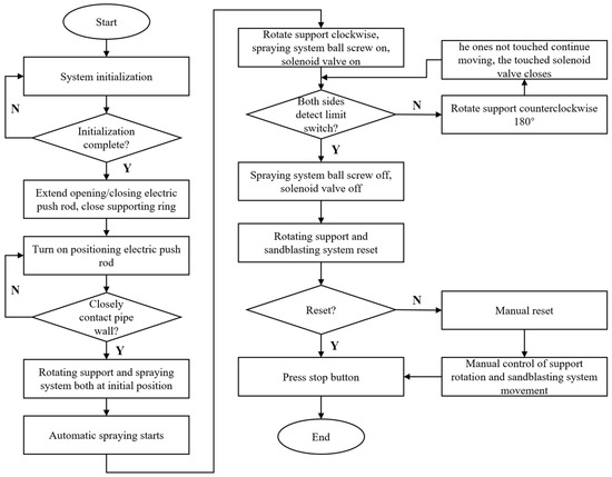 The primer application system is symmetrically equipped with two spray modules and nozzles. During the base-coat spraying operation, the apparatus requires only a 180° rotation to achieve full coverage of the repair (field-joint) area. Before each spraying run, the primer must be installed into the designated spraying module. The air supply—provided by a pump located on the support vehicle—is connected to the spray modules via pneumatic tubing. To ensure the quality of heat shrink tape wrapping, the uniformity of the coating should be ensured during primer spraying. The thickness of the primer shall not be less than 400 μm, and the width of the paint spraying area shall be 300 mm. Figure 14 shows the control diagram for primer spraying.
