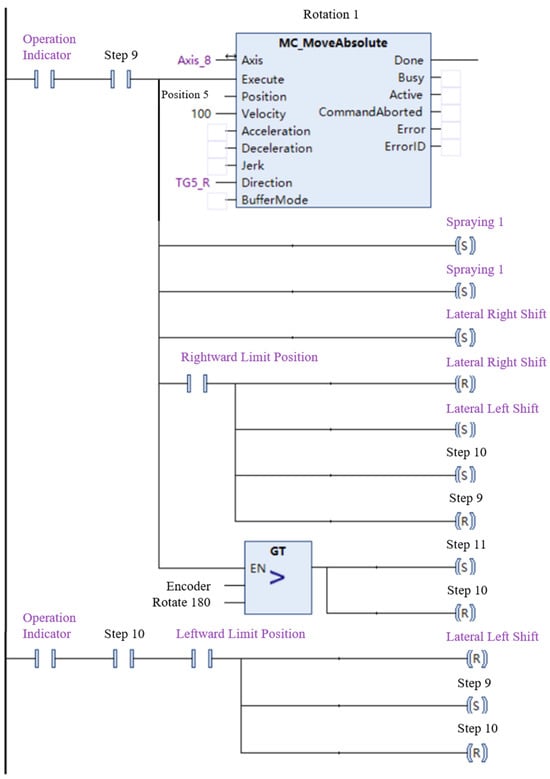 During the operation of the spray-painting module, the following sequence is executed: Clamp engagement initiates, followed by positive (clockwise) rotation—starting at Position 5. Each operation step consists of a 15° clockwise rotation. The nozzle assembly moves laterally rightwards by 180°, holds position, then moves leftwards back to the original orientation. Upon completion of the lateral shift, clockwise rotation resumes, and the cycle repeats. Rotation position is monitored via an encoder; upon reaching the half-circle (180°) position, the system triggers exit motion and rotation reset. This full pattern follows the loop illustrated in Figure 15, “R” is reset, “S” is set.