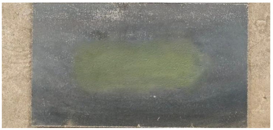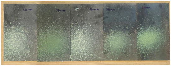 Dynamic spraying at a traverse speed of 0.3 m/s produced a stripe-like thickness profile, as illustrated in Figure 18. Thickness data were measured along the centerline in the nozzle movement direction using a thickness gauge, and these experimental datasets were compared to simulation results, yielding the plot shown in Figure 19. The comparison between simulation and experiment demonstrates a strong consistency in the thickness distribution profiles. The maximum relative error observed was as follows: . When the spray speed is 0.3 m/s, coating thickness requirements are met while maintaining efficient application. Under these conditions, the maximum deviation in thickness was as follows: . Thus, the alignment between numerical simulation and experimental data validates both the reliability of the numerical modeling approach and the accuracy of the computed results.