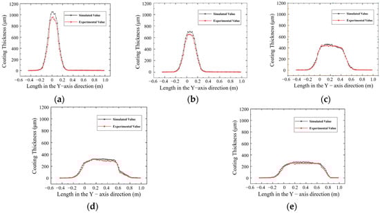 Comparison plot of paint layer thickness: experimental vs. simulation results. (a) Spray gun movement speed 0.1 m/s; (b) Spray gun movement speed 0.2 m/s; (c) Spray gun movement speed 0.3 m/s; (d) Spray gun movement speed 0.4 m/s; (e) Spray gun movement speed 0.5 m/s.