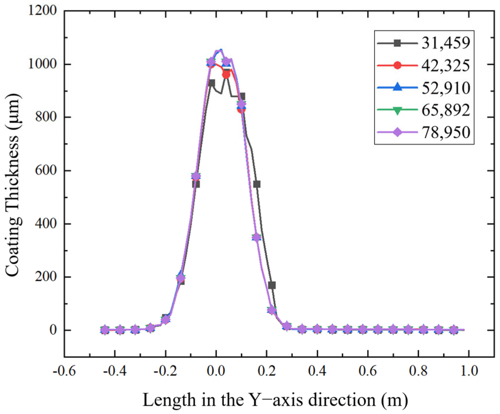 Y-axis across different mesh densities (31,459; 42,325; 52,910; 65,892; 78,950 cells). The results show that as mesh density increases, the thickness distribution curves converge, with negligible variation beyond 52,910 cells—indicating mesh independence. Thus, the simulations have passed the mesh-independence test, and meshes containing more than 52,910 cells are deemed sufficient to ensure accuracy while maintaining computational efficiency. The final meshes are illustrated in