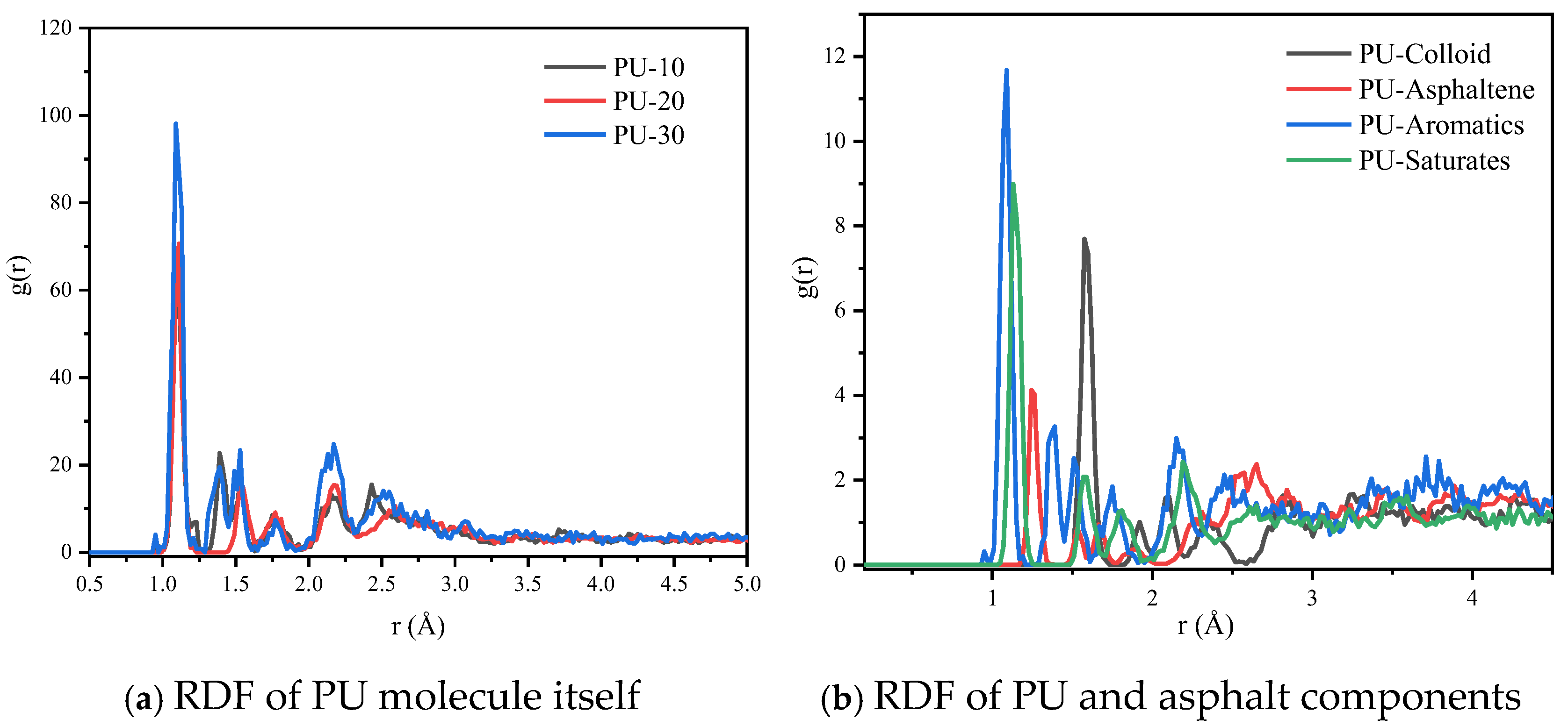 - Shi, W.; Wei, K.; Guo, X.; Ni, T.; Tian, J. Study on the interfacial adhesion performance of polyurethane-modified asphalt based on molecular dynamics simulation. Appl. Surf. Sci. 2025, 685, 162041. [Google Scholar] [CrossRef]