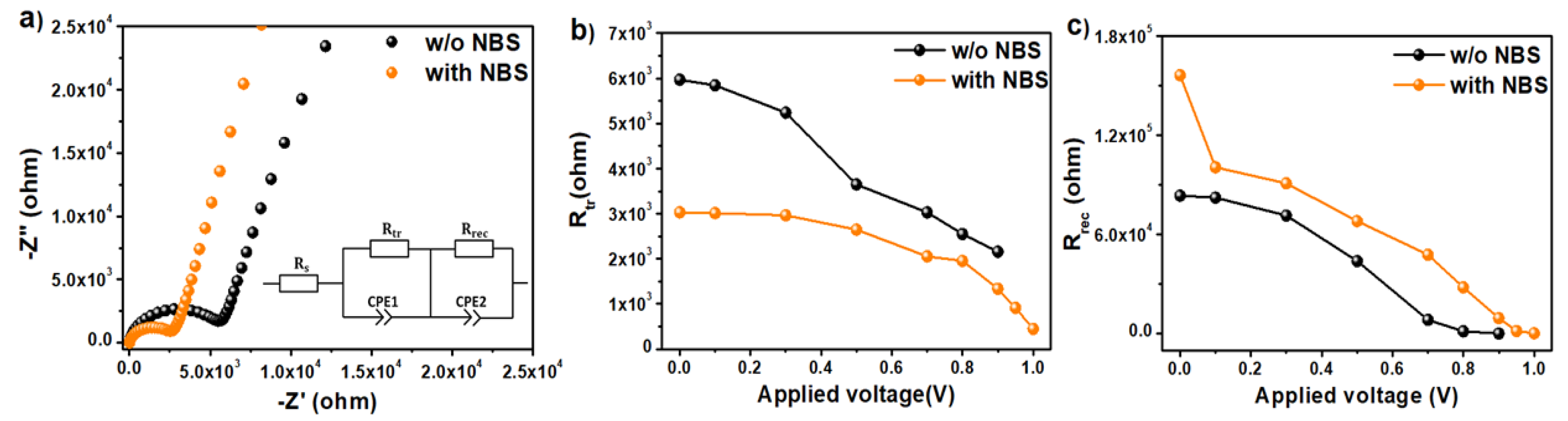 - Srivastava, V.; Alexander, A.; Anitha, B.; Namboothiry, M.A. Impedance spectroscopy study of defect/ion mediated electric field and its effect on the photovoltaic performance of perovskite solar cells based on different active layers. Sol. Energy Mater. Sol. Cells 2022, 237, 111548. [Google Scholar] [CrossRef]
