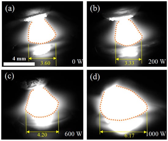 The morphology of HTAAL at the stable discharge stage under different laser powers is shown in Figure 2. The differences in arc shapes are highly noticeable. By comparing Figure 2a,b, it can be observed that the width of 200 W HTAAL is reduced by 0.27 mm compared with HTA, indicating that the arc volume has contracted to a certain extent. This suggests that the 200 W laser exerts a volume compression effect on the HTA. However, when the laser power increases to 600 W, the coupled thermal source width increased to 4.2 mm, an increase of 0.87 mm compared with the 200 W HTAAL while maintaining good symmetry and stability. Under 1000 W laser power, HTAAL undergoes significant expansion, resulting in an increase in width to 6.17 mm, almost twice that of 200 W HTAAL, and also resulted in an asymmetrical heat source.