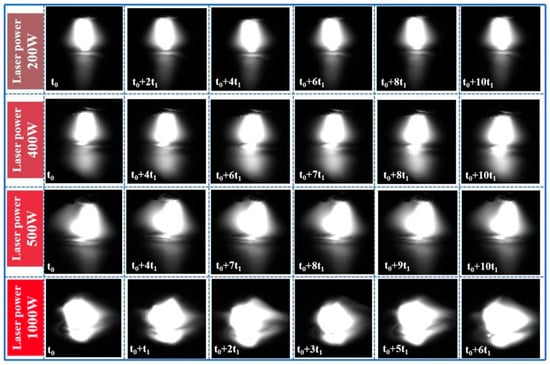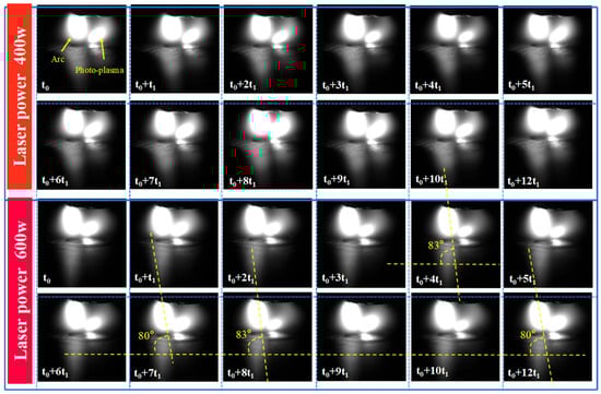 The discharge process of the heat source under different laser power conditions was tracked and recorded, and the results are shown in Figure 3. When the laser power was 200 W, the HTAAL morphology remained consistent throughout the entire process, and the discharge was stable. When the laser power increased to 400 W, the HTA began to bulge slightly outward due to the attraction of the laser, while the arc discharge remained stable throughout the welding process. At time t0, a slight bulge appeared at the bottom of the arc due to laser attraction, which persisted until time t0 + 4t1. At time t0 + 6t1, a slight expansion in the arc volume was observed, but by time t0 + 7t1, the heat source quickly returned to its state at t0. These observations indicate that as laser power increased from 200 W to 400 W, the laser exerted a noticeable attractive and compressive effect on the arc, displaying periodic characteristics. Under the influence of the laser, the HTA exhibited a periodic volume change, where compression was followed by restoration, with a period of 1.4 ms. Additionally, the sequence of arc volume change progressed from bottom protrusion to middle expansion.