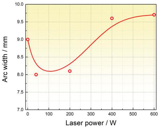 When the laser power is greater than 40 W and less than 200 W, the HTA volume contracts and decreases. However, when the laser power increases to 400 W, the HTA volume expands. After a 40 W fiber laser is applied to the hollow tungsten electrode arc, the width of the lower middle part of the heat source decreases significantly, while the width of the upper part increases slightly. The width of the lower part of the heat source, where the temperature exceeds 6000 K, contracts from 9 mm to 8.2 mm, a reduction of 0.8 mm, while the upper width increases by 0.6 mm. As the laser power increases from 40 W to 200 W, the HTA volume remains constant, while the core temperature gradually rises, and the shape of the high-temperature zone changes. When the laser power gradually increases from 200 W to 600 W, the arc width expands from 8.2 mm to 9.6 mm. The statistical results are shown in Figure 5. In the coaxial composite processing of HTAAL, the laser has a significant volume compression effect on the HTA, which helps optimize the energy density of the heat source and reduce the width of the heat-affected zone in thermal processing.