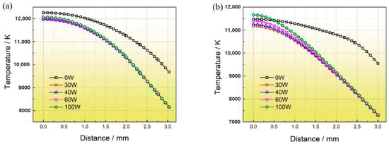 The statistical results of the effect of laser power on the bottom temperature field of the coupled heat source are shown in Figure 6. The temperature distribution of HTAAL from the center outward at positions 1 mm and 1.5 mm above the workpiece surface has been calculated by numerical simulation. When the tip of the tungsten electrode is 4 mm away from the surface of the workpiece, the temperature at the center of the coupled heat source with a laser power increased from 30 W to 100 W at 1.5 mm above the workpiece are lower than that of HTA under the same welding current conditions. However, from the radial temperature comparison curve of the heat source at 1 mm above the workpiece, it can be observed that the temperature of the coupled heat source with a laser power below 60 W is lower than that of the HTA. When the laser power increases to 100 W, the temperature becomes higher than that of HTA. This differs from the temperature distribution between the 1.5 mm position and the 1 mm position, indicating that the effect of laser on the axial spatial temperature of HTAAL is related to the position and that the closer to the workpiece surface, the greater the influence of the laser on the coupled heat source temperature. The redistribution of the arc central temperature and the temperature in the middle and lower parts of the anode surface may be the fundamental reason for arc volume contraction.
